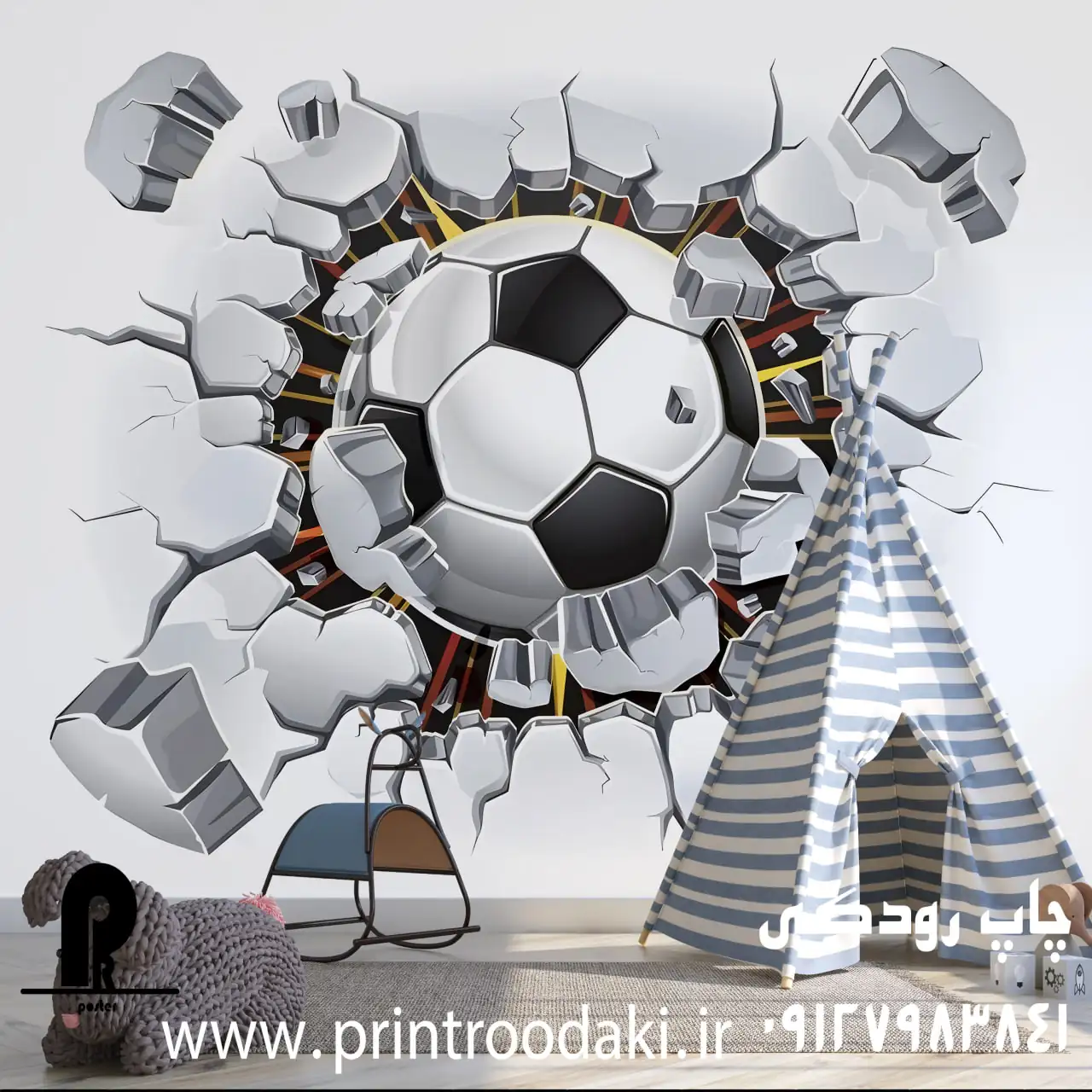 پوستر دیواری توپ فوتبال پسرونه اتاق کودک را به یک استادیوم واقعی تبدیل میکند. توپ فوتبال بزرگ و سهبعدی از دیوار بیرون میزند. قطعات شکسته دیوار اطراف آن پراکندهاند. این جلوه پرقدرت حس حرکت و انرژی میدهد. بچهها عاشق این طرح میشوند، چون انگار توپ واقعاً به سمتشان میآید!