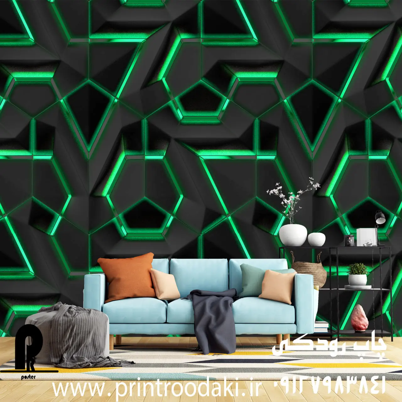 پوستر دیواری سه بعدی سبز و مشکی – طرح هندسی نئونی برای دکوراسیونی futuristic