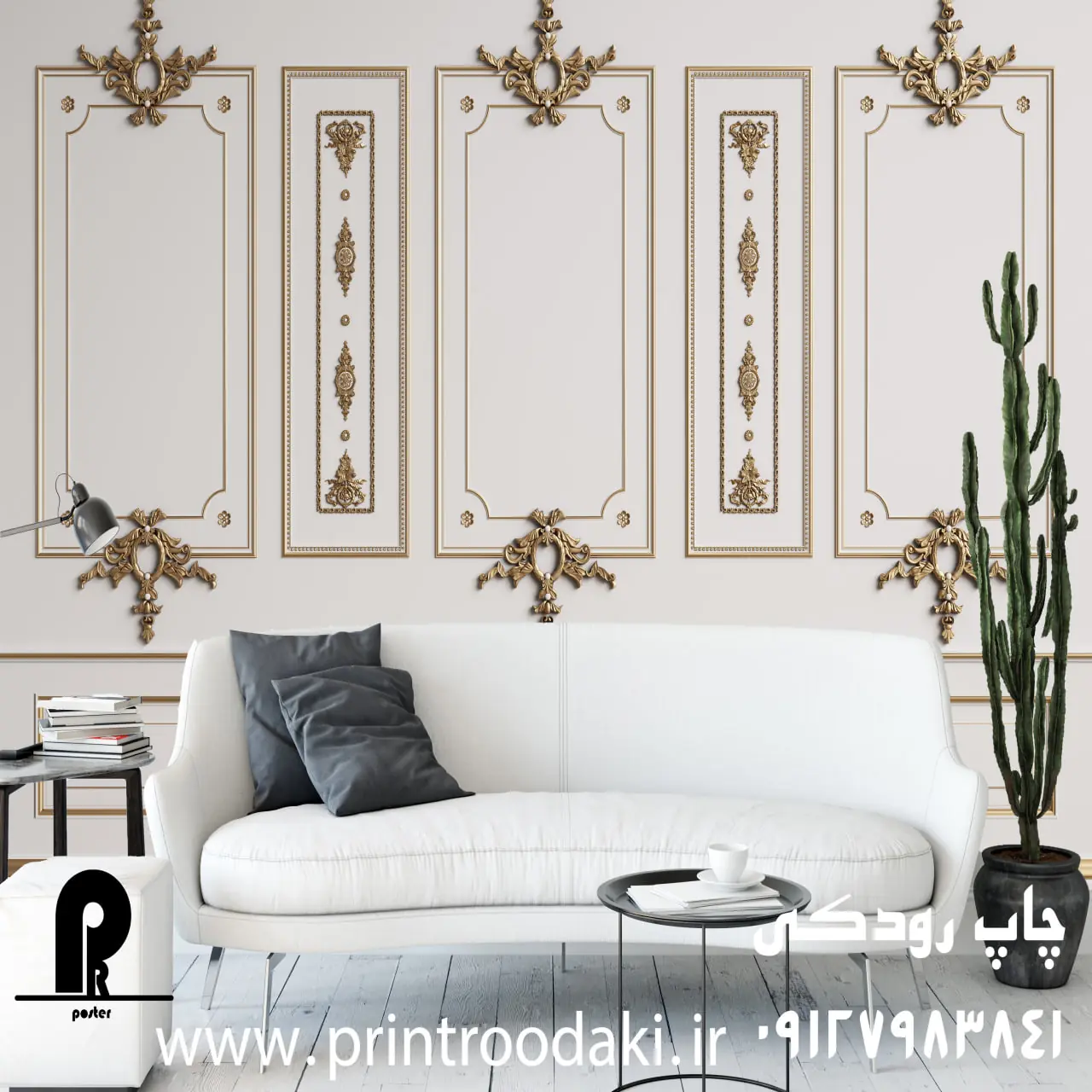 پرینت رودکی، متخصص چاپ پوسترهای دیواری لوکس و کلاسیک، **پوستر دیواری قاب کرم طلایی** را به عنوان یکی از مجللترین طرحهای خود عرضه میکند. این طرح با پنلهای بزرگ کرمرنگ، قابهای طلایی برجسته و گچبریهای ظریف در بالا و پایین، حس یک کاخ سلطنتی اروپایی را به فضای داخلی شما میآورد و دیوارها را به یک اثر هنری باشکوه تبدیل میکند.