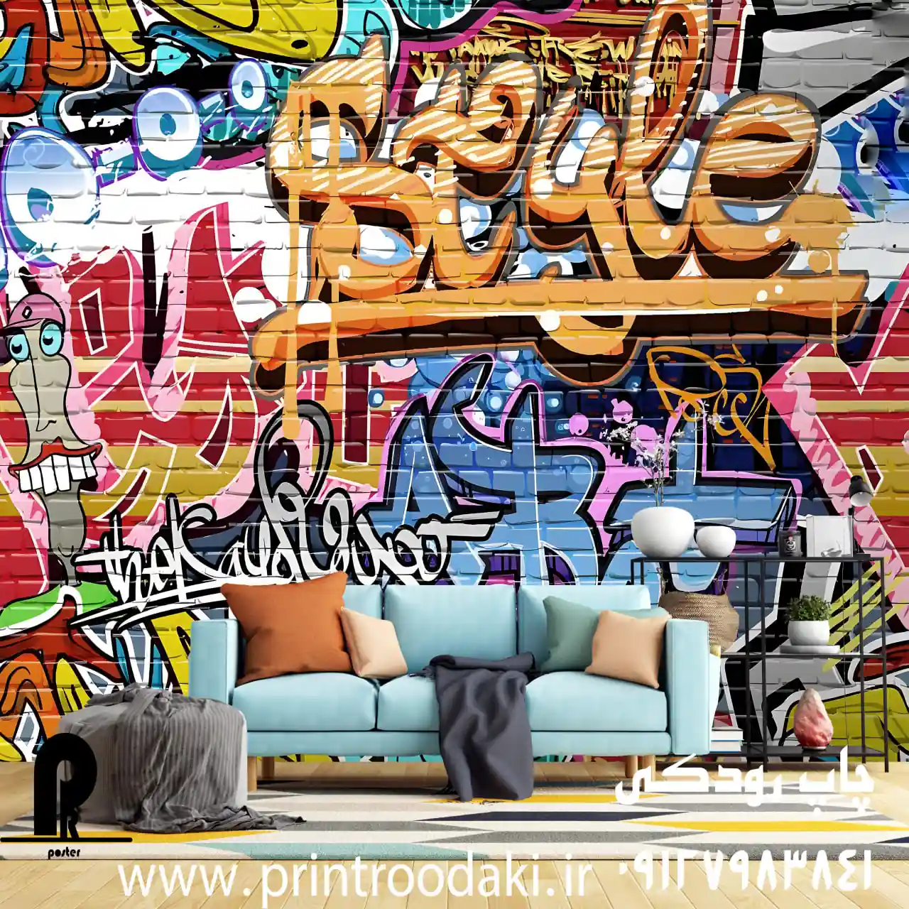 این پوستر دیواری با جزئیات فوقالعاده بالا طراحی شده است. بافت آجر قرمز و سفید بهگونهای واقعی چاپ میشود که انگار دیوار شما واقعاً با اسپری و قلم مو نقاشی شده است. حروف بزرگ و برجسته، کاراکترهای کارتونی جذاب و رنگهای زنده (نارنجی، آبی، صورتی و زرد) عمق و حرکت را به فضا اضافه میکنند. این طرح نه تنها یک پوشش دیواری ساده نیست، بلکه یک اثر هنری کامل است که نگاه هر بینندهای را به خود جلب میکند.
