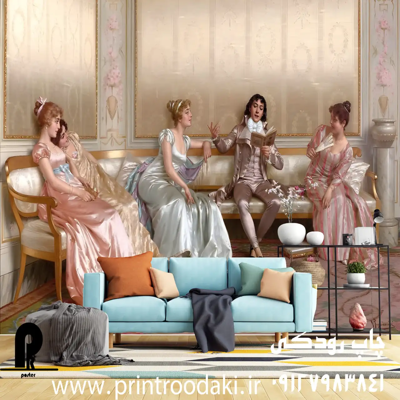 پوستر دیواری نقاشی قدیمی چهار زن و یک مرد با سبک کلاسیک اروپایی و رنگ‌های پاستلی. چاپ دیجیتال باکیفیت روی کاغذ ضدخش و قابل شستشو. مناسب دکوراسیون لوکس ۲۰۲۶ و فضاهای پذیرایی. ابعاد دلخواه و ارسال سریع.