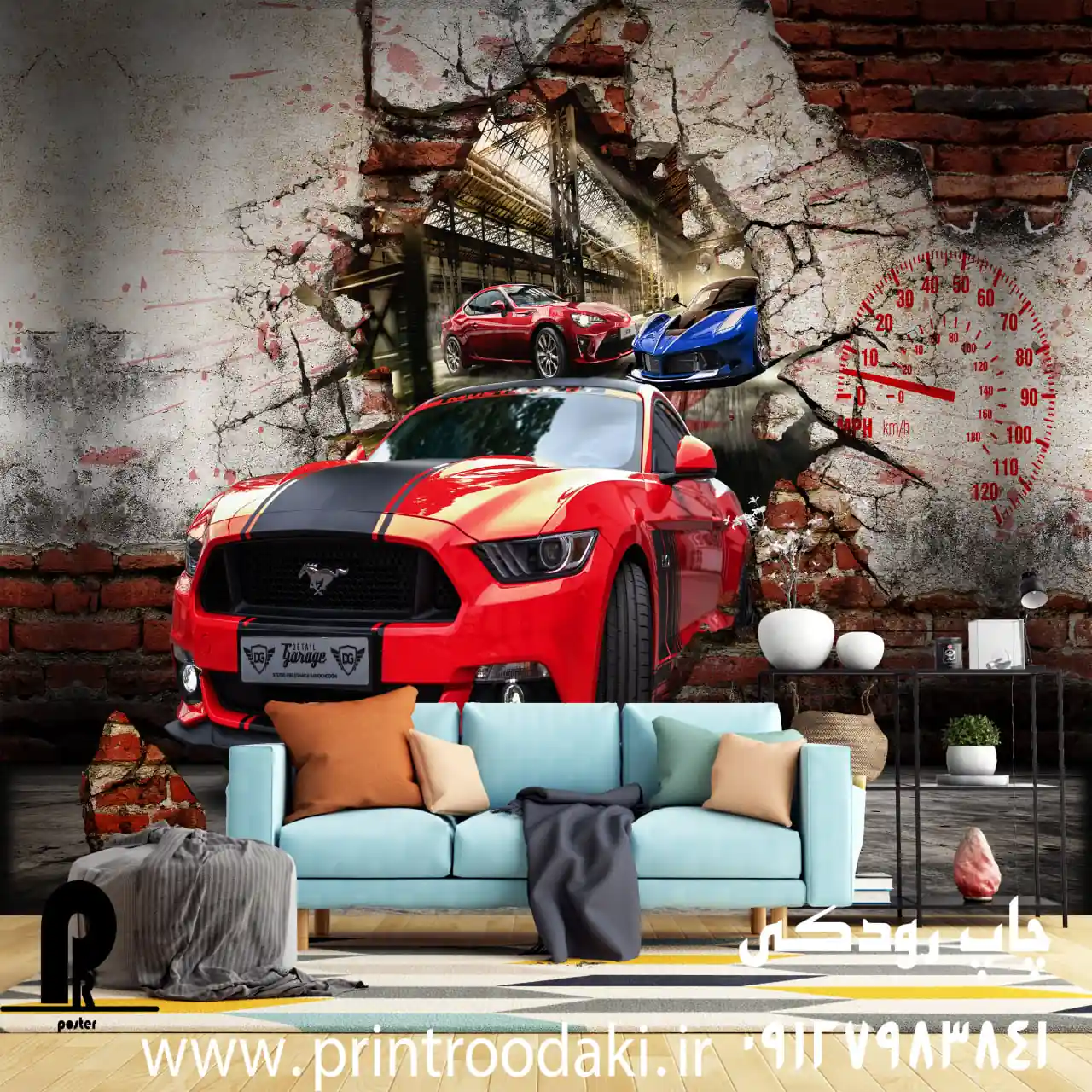 برای نوجوانانی که عاشق سرعت، ماشین‌های اسپرت و هیجان هستند، پوستر دیواری نوجوان موستانگ قرمز از سایت پرینت رودکی یک انتخاب فوق‌العاده است. این پوستر سه‌بعدی با طراحی خیره‌کننده، یک فورد موستانگ قرمز براق را نشان می‌دهد که گویی با قدرت تمام از دیوار آجری شکسته و ترک‌خورده بیرون زده است. در پس‌زمینه، دو ماشین اسپرت دیگر – یکی قرمز و یکی آبی – در حال مسابقه هستند و یک سرعت‌سنج بزرگ با عقربه روی سرعت‌های بالا، حس حرکت و آدرنالین را القا می‌کند. بافت آجرهای قرمز و سفید شکسته، جلوه‌ای واقعی و پویا ایجاد کرده و فضایی صنعتی-مدرن به اتاق می‌بخشد. این طرح ایده‌آل برای دکوراسیون اتاق نوجوان با تم ماشین و علاقه‌مندان به خودروهای عضلانی مانند موستانگ است.