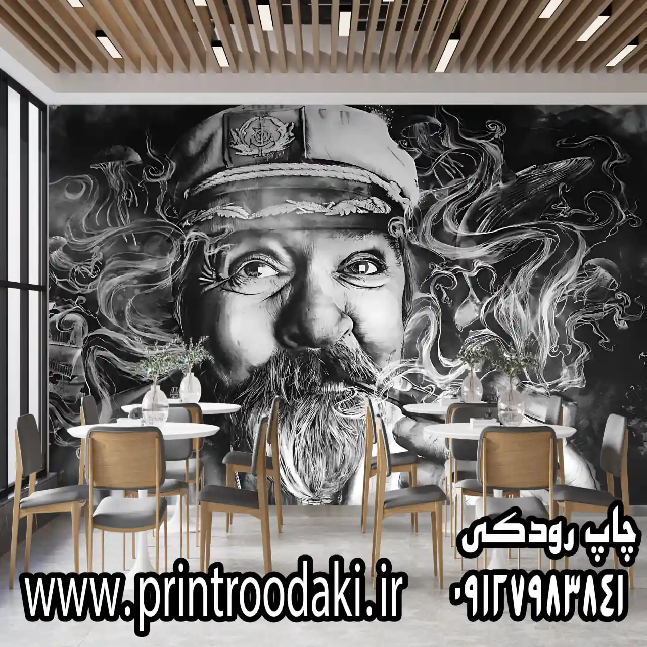 والپیپر پیرمرد ملوان: طرح هنری سیاه‌وسفید با چهره ملوان و دود مرموز. چاپ حرفه‌ای ماندگار – جلوه‌ای دراماتیک برای کافی‌شاپ‌های تم دریایی و فضاهای صنعتی. سفارش سریع!