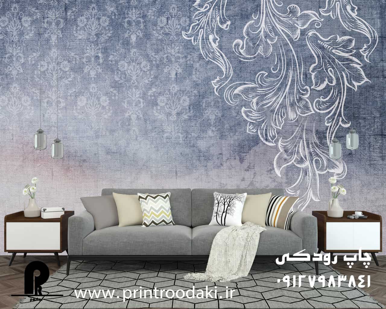 در تصویر نمونه، این پوستر دیواری پشت مبل راحتی خاکستری نصب شده و با دو آباژور آویز و گلدانهای مینیمال، فضایی آرامشبخش و مجلل خلق کرده است. طرح گل و بته سفید در گوشه سمت راست، نقطه عطف طراحی بوده و چشم را به سمت خود میکشاند.
